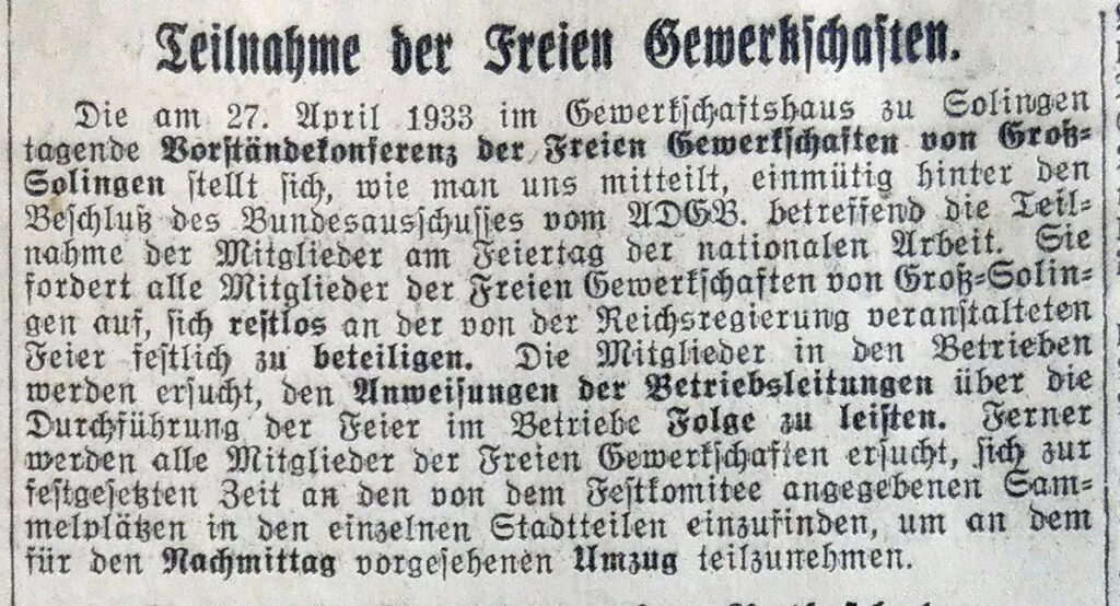 Der sozialdemokratisch dominierte Allgemeine Deutsche Gewerkschaftsbund (ADGB) hatte auch in Solingen gehofft, dass seine Gewerkschaften vom NS-Regime verschont bleiben würden, und bot nach der Machtübernahme seine Mitarbeit an. So hatte der ADGB gemeinsam mit der NS‑Gewerkschaft „Nationalsozialistische Betriebszellenorganisation“ (NSBO) zur 1. Mai-Feier eingeladen.